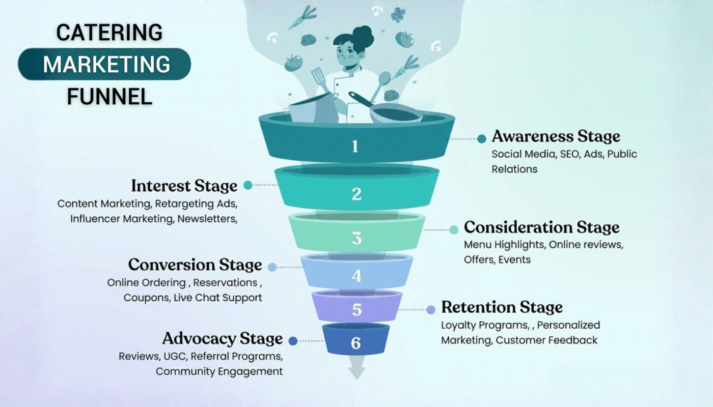The mistake many catering brands make is jumping straight to the final stage. Posting prices and booking links too early can feel abrupt. A well planned funnel builds interest first then gently encourages action.